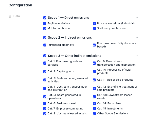 - Al crear un proyecto: se crea con todas las categorías GHG y desde Ajustes del proyecto dejas marcadas solo las que aplican (Scope 1&2, Scope 1,2 & 3 con Cat 1+3, las 15…).